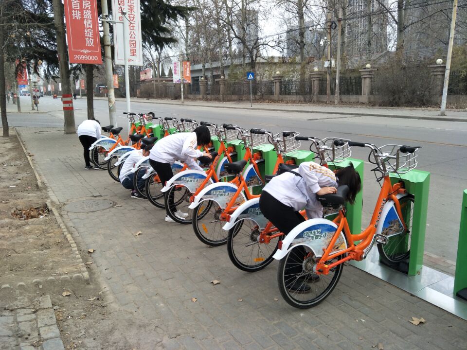 志愿者分别对尧都公园、临汾市人民政府、美特好超市、永利3044noc体育公司等4处站点的公交自行车、驻锁以及停靠设施进行了全面的清洁。志愿者们带着毛巾和水等清洁工具,在不影响市民租赁的情况下,对自行车进行仔细清洗。大家相互合作,合理分工,积极配合,从车把手到坐垫,从车身到车轮,从自行车到锁桩,同学们用心擦洗,不放过任何一个卫生死角。寒风凛冽中,志愿者们毫不退缩,积极热情地投入到清洁工作中,现场忙碌不已。经过一下午的努力,公共自行车站点的公共自行车焕然一新。同学们的工作不仅是让周边的公共自行车变得洁净,更向社会传达一种正能量:爱护公物,奉献社会,是每一个公民应尽的义务。