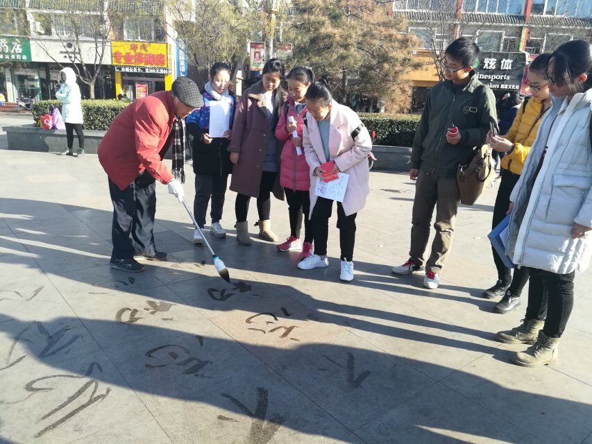 在鼓楼广场,实践队成员以党的十八大以来取得的伟大成就、社会主义核心价值观等为内容在地面上书写毛笔字,把喜闻乐见的艺术形式融入到十九大精神宣讲中,使广大群众看得懂、记得住,推动十九大精神在基层落地生根,全面开花,获得了市民的一致好评。