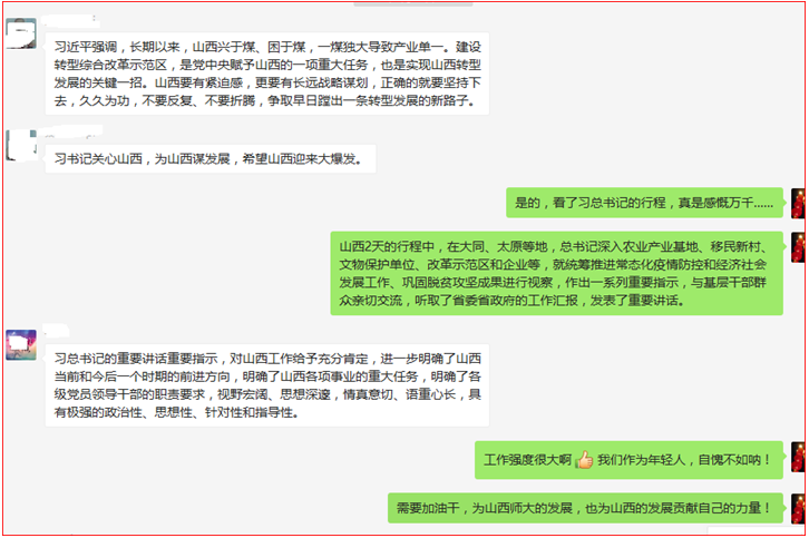 29日晚,支部党员进行了热烈的线上讨论,交流了学习心得。大家一致认为,习近平总书记视察山西的重要指示重要讲话振奋人心,深受启发,倍受鼓舞,要立足教育本职工作,做好科学研究,要立足山西、面向未来,勇担立德树人、培养人才大军的使命。我们既要培养素质过硬的教师队伍,也要培养创造力强、素质优良、活力迸发的社会主义建设者和接班人,为山西的转型发展作出贡献。