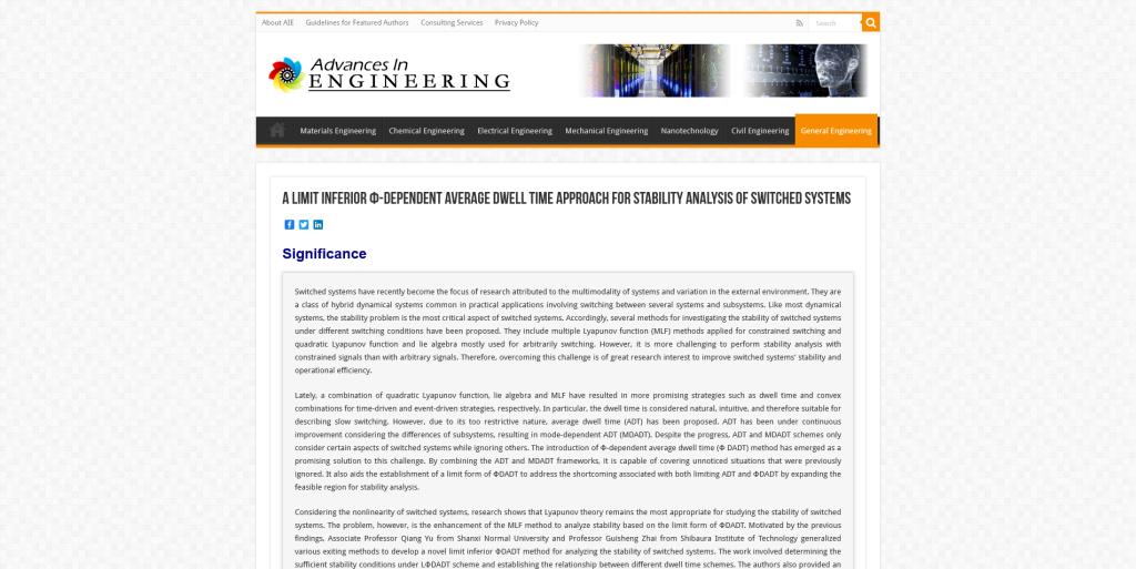 近日,永利3044noc玉强副教授在控制领域著名Top期刊International Journal of Robust and Nonlinear Control上发表的论文“A limit inferiorΦ-dependentaveragedwell time approach for stability analysis of switched systems”被国际著名工程科技新闻网站Advances In Engineering(AIE)评选为工程科技领域的“Key Scientific Article(关键科学论文)”,并在general Engineering栏目予以专题报道。玉强副教授为该论文的第一作者兼通讯作者,日本芝浦工业大学的翟贵生教授为该文另一合作者。