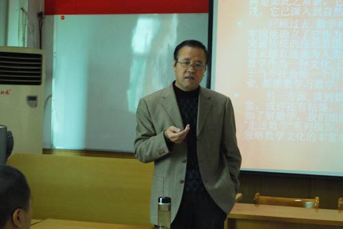 10月20日上午9点,"走进数学"系列的首场报告在05203报告厅举行。博士生导师张勤海教授作了题为"从对称谈起"的科普报告。他首先列举了大量日常生活中的对称实例,随后,从"什么是对称"、"为什么要研究对称"、"如何研究对称"三个方面解释了对称与群论的关系。张勤海教授的报告使在场的师生对对称有了全面深刻的认识。最后,张勤海教授与在场的师生进行了互动,他耐心解答了大家的疑问,赢得了阵阵掌声。