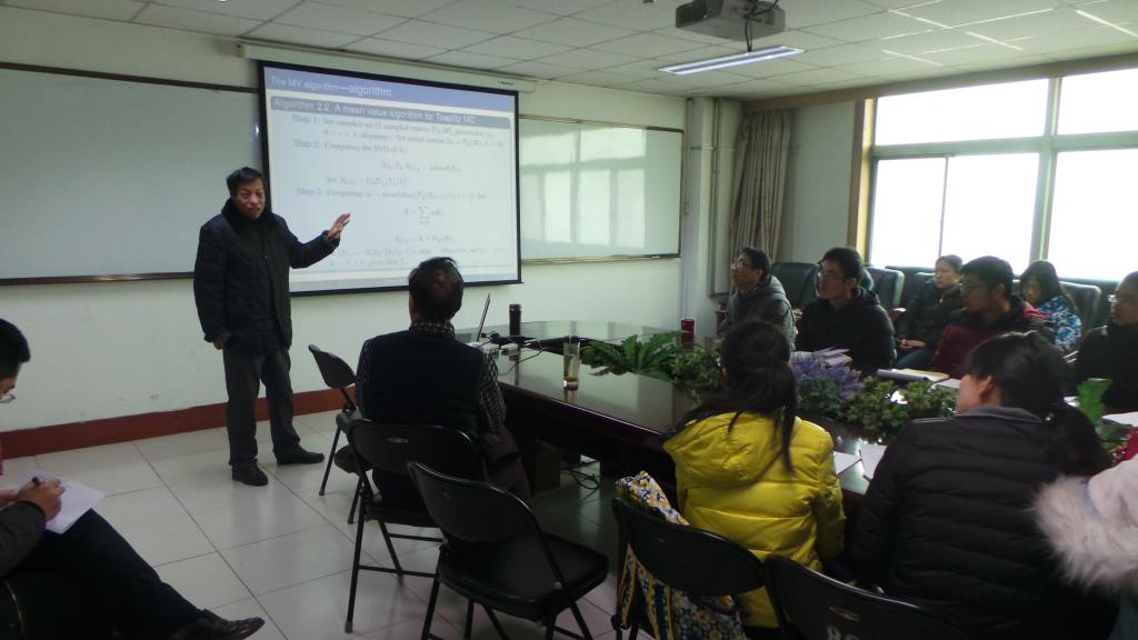 2016年1月2日,在永利3044noc科学会堂A座802会议室,山西太原师范公司的王川龙教授做了题为New Algorithms for Toeplitz Matrix Reconstruction的学术报告。在当天的学术报告上,王川龙先从矩阵填充(Matrix)方面介绍了问题的研究思路,即转化为凸优化问题,解决唯一解。并介绍了FPCA、APG、SVT、ALM(lagrange乘子算法)等凸优化算法。其次从矩阵恢复(recover)方面进行了介绍,结合应用实例,比较了保结构算法和平均值算法等研究方法的优缺点。
