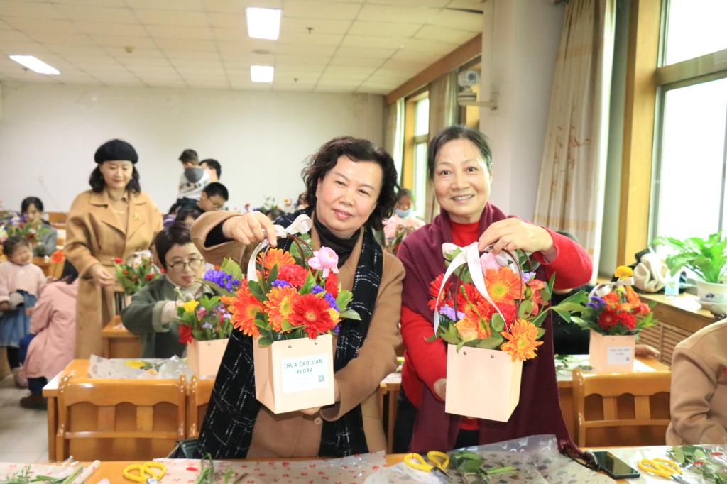 活动伊始,花艺师为女教师们讲解了花艺的分类和插花的原则。插花艺术和绘画、建筑、雕塑等等是相通的,插花中要注意黄金分割比例、色彩、主次关系、平衡等。随后,插花创作拉开帷幕。老师们用鲜花精心设计创作,巧手翻飞系蝴蝶结、剪枝、插花,现场欢声笑语不断,气氛轻松愉悦。一枝花、一棵草,在教师们的巧手下变的诗情画意、格调高雅、清新怡人。活动结束后,女同志们提着自己亲手制作的花篮合影留念。