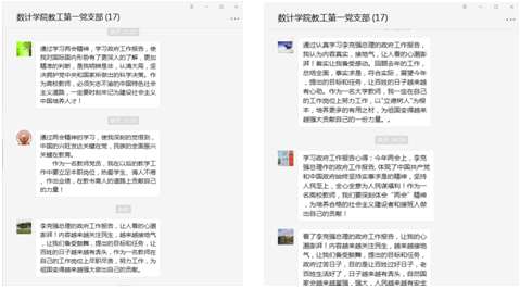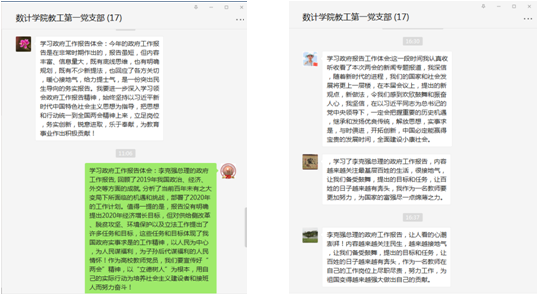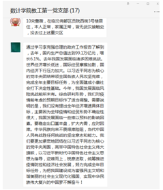 全体党员一起学习了习近平两会期间的重要讲话和李克强总理在2020年5月22日第十三届全国人民代表大会第三次会议上所做的政府工作报告。通过学习,同志们对习近平总书记“以人民为中心”、“人民至上”的发展思想有了更深刻的认识,对社会主义制度的优越性有了更深刻的认识,对我国当前一个阶段的国情和面临的国际形势有了更多的了解,“四个自信”更加坚定了,纷纷表示要在自己的工作岗位上努力工作,以“立德树人”为根本,为培养社会主义建设者和接班人而努力奋斗!