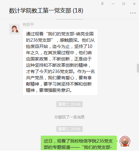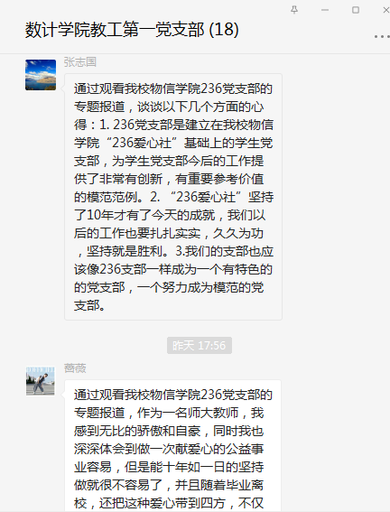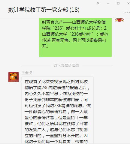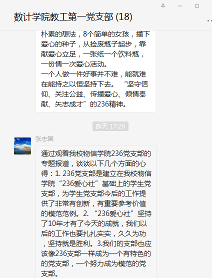 近日,按照公司党委组织部的安排,我支部党员自行观看了“百集建党纪录片”《我们的党支部---响亮全国的236党支部》,并在支部群里进行了体会发言和交流讨论。