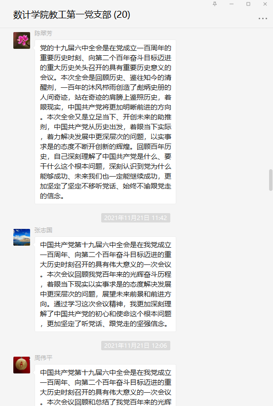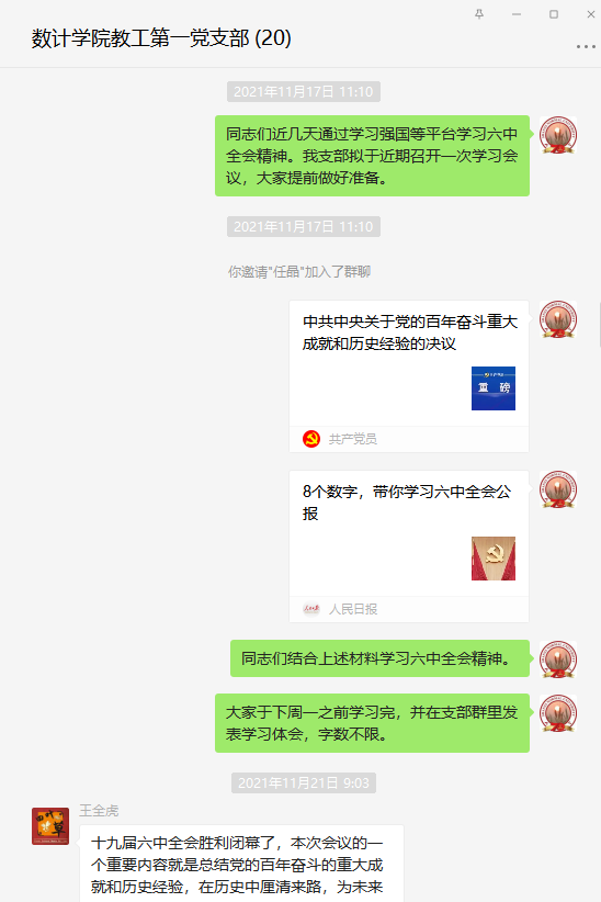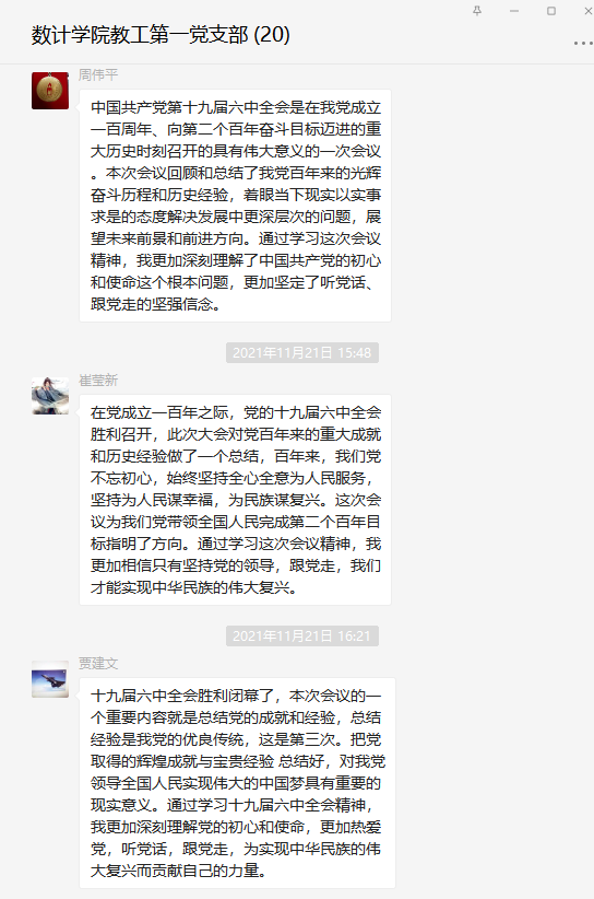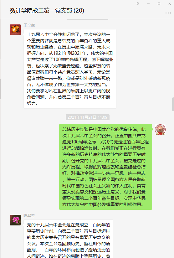 近期,永利3044noc教工第一党支部组织全体党员以线下自学,线上交流的线上线下结合学的方式,学习党的十九届六中全会的相关材料和会议精神,在支部微信群里发表了学习体会,并通过腾讯会议召开了学习交流会议。